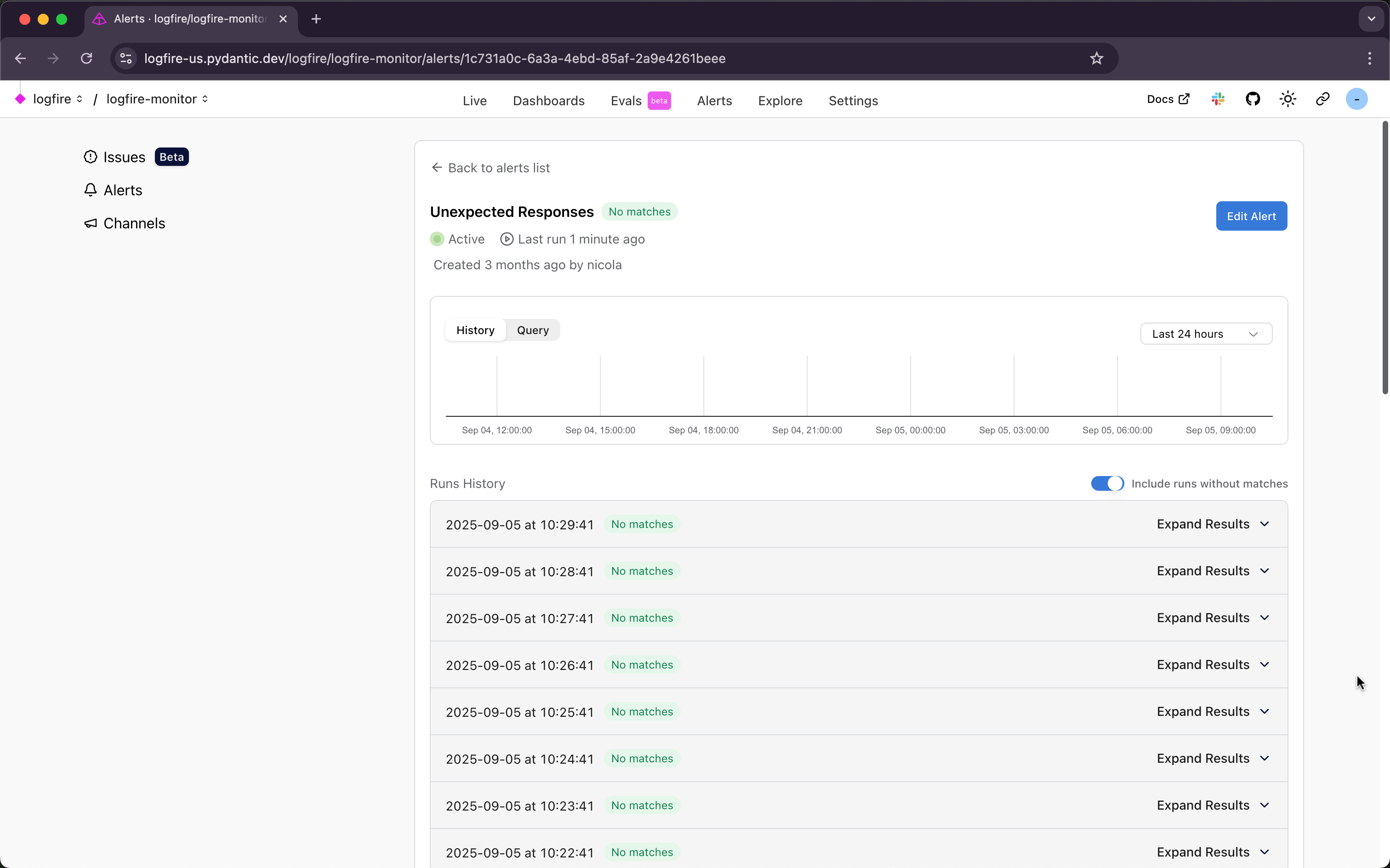 With Logfire, use Alerts to notify you when certain conditions are met.