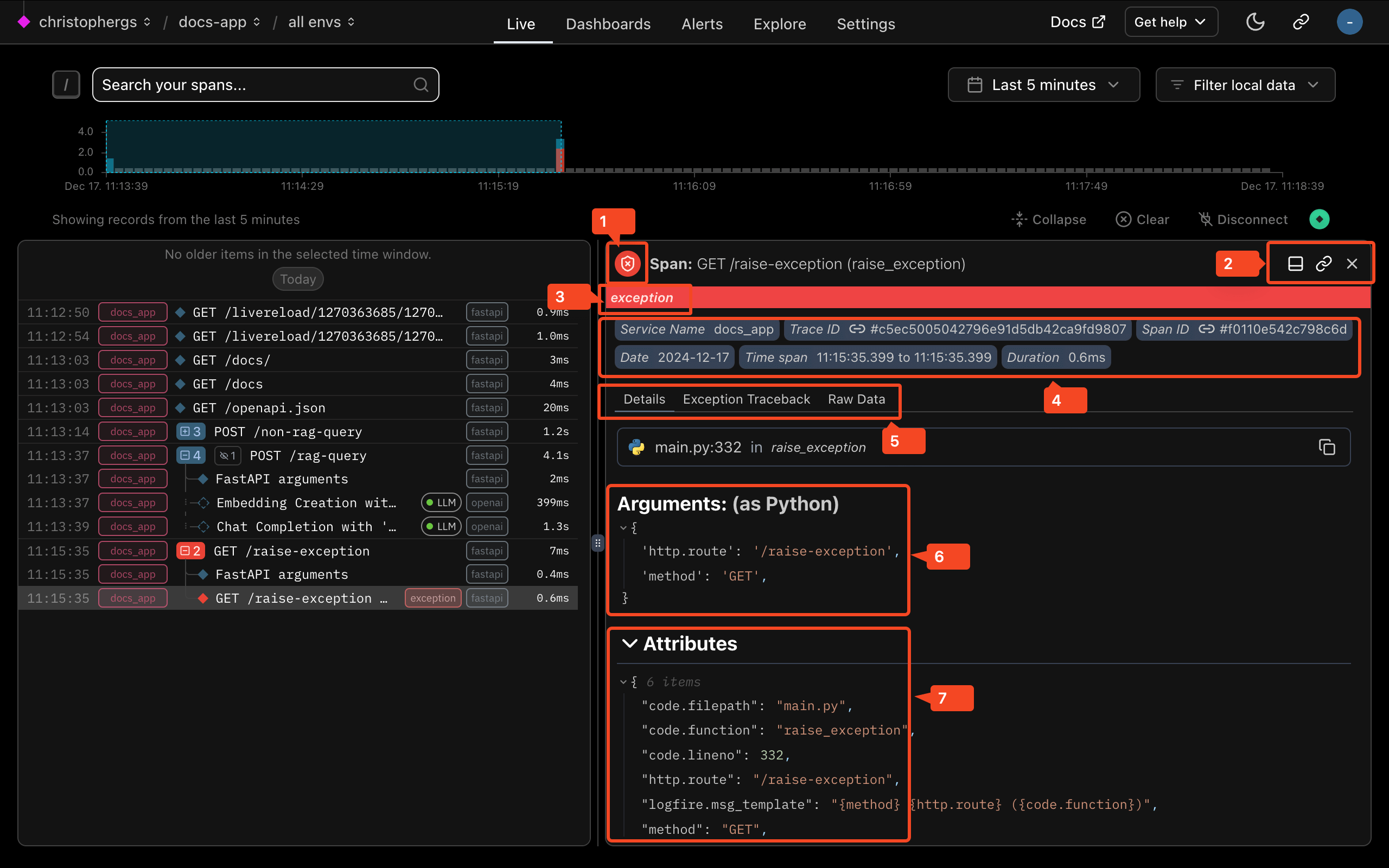 3. Exception warning: This exception indicator is present because an exception bubbled through this span. You can see more details in the Exception Traceback details tab.